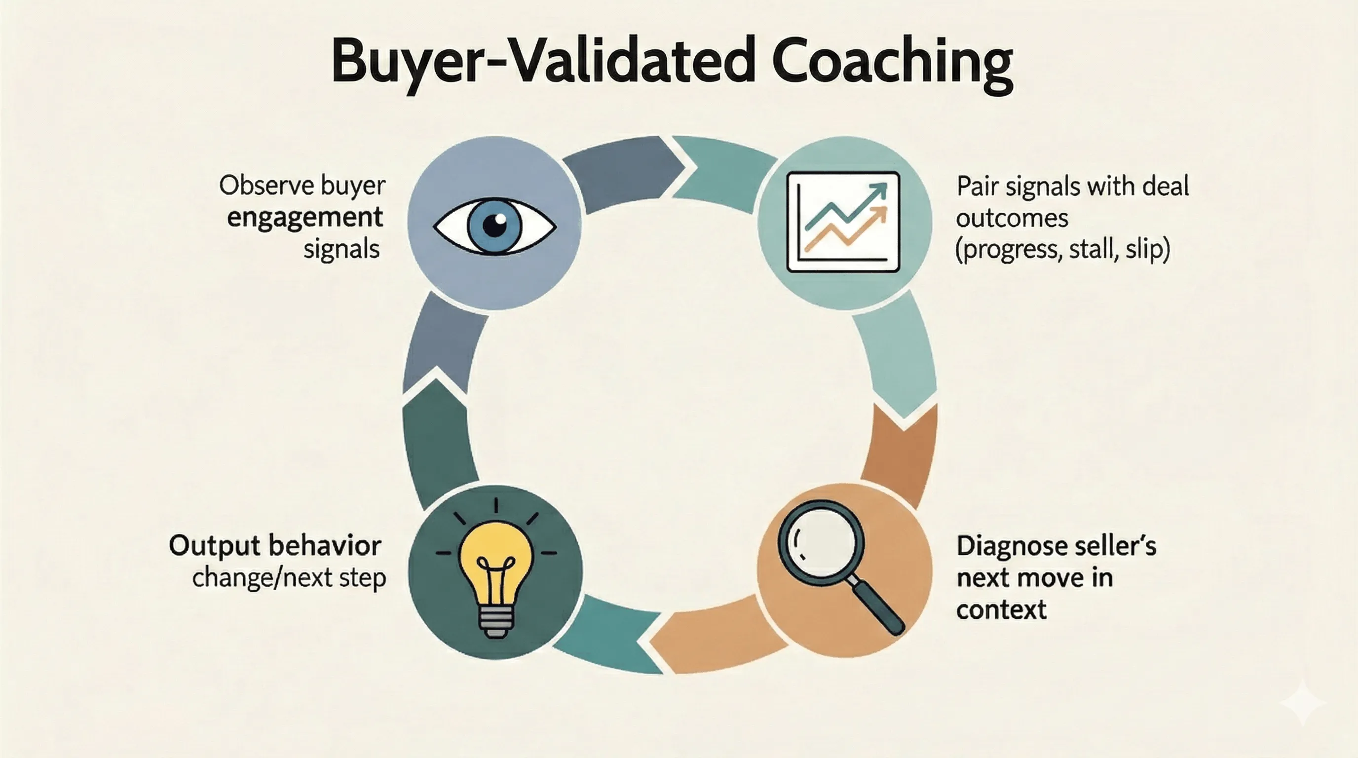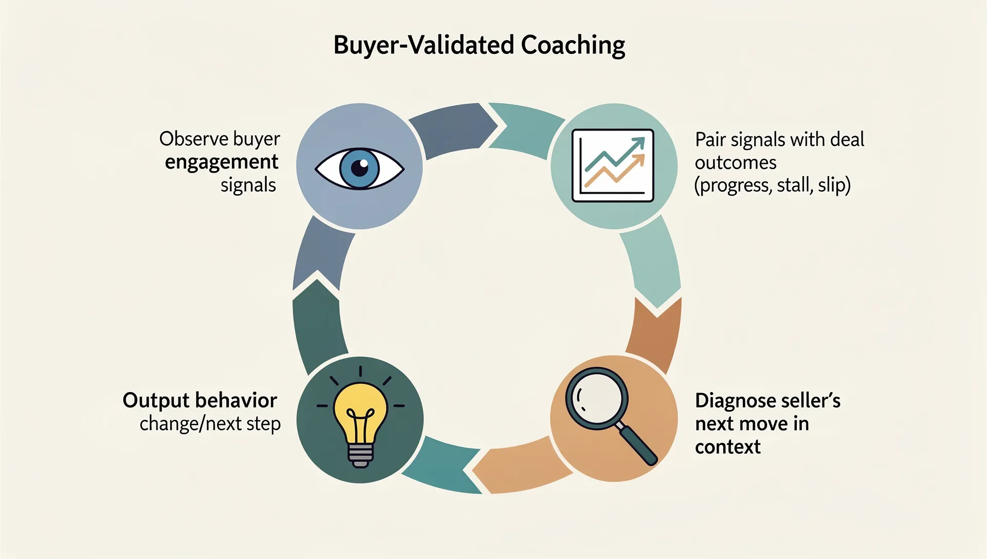 Buyer-Validated Coaching is the north star: coaching grounded in buyer engagement signals, deal outcomes, and seller behavior.