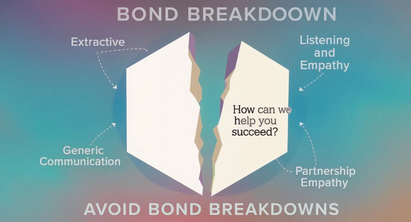 Bond breakdowns can happen when the buyer senses that the experience is purely transactional and that the seller's questions are "extractive" rather than supportive. Buyers are just people, and all humans want to feel seen, listened to, and valued.